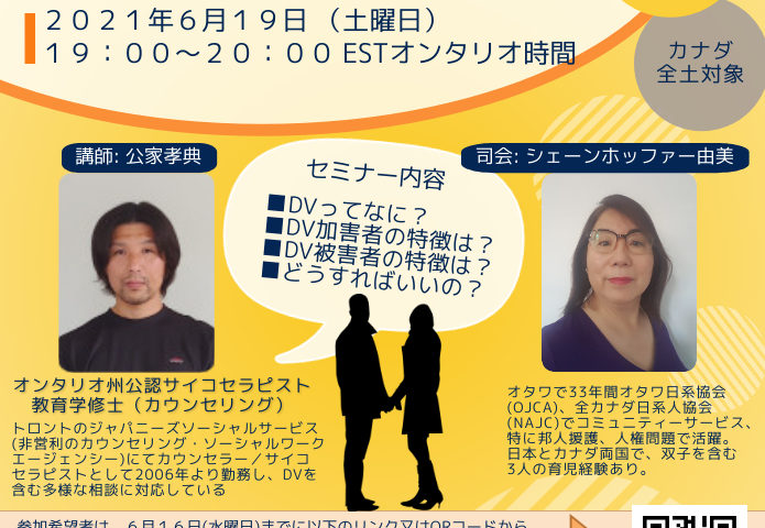 Organizers: Jamsnetcanada, NAJC Do you think you know!? What is DV (Domestic Violence)? Saturday June 19, 2021 19:00-20:00 ET (Ontario time) Free, Canada wide Contents: What is DV? DV accusers characteristics DV victims characteristics What to do? Presenter: Takanori Kuge Ontario certified psychotherapist, M.A.(counseling) Since 2006, working as counselor/psychotherapist at Japanese Social Services (JSS), non...Continue reading
